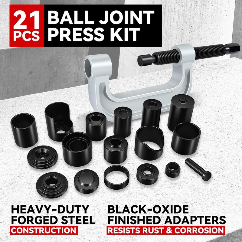 - User-Friendly Design - Featuring a heavy-duty forged C clamp set, this 21-piece ball joint press kit simplifies the removal and installation of press-fit components like ball joints, universal joints, and truck brake anchor pins. Its straightforward design makes it easy to use for professionals and DIY enthusiasts alike.
