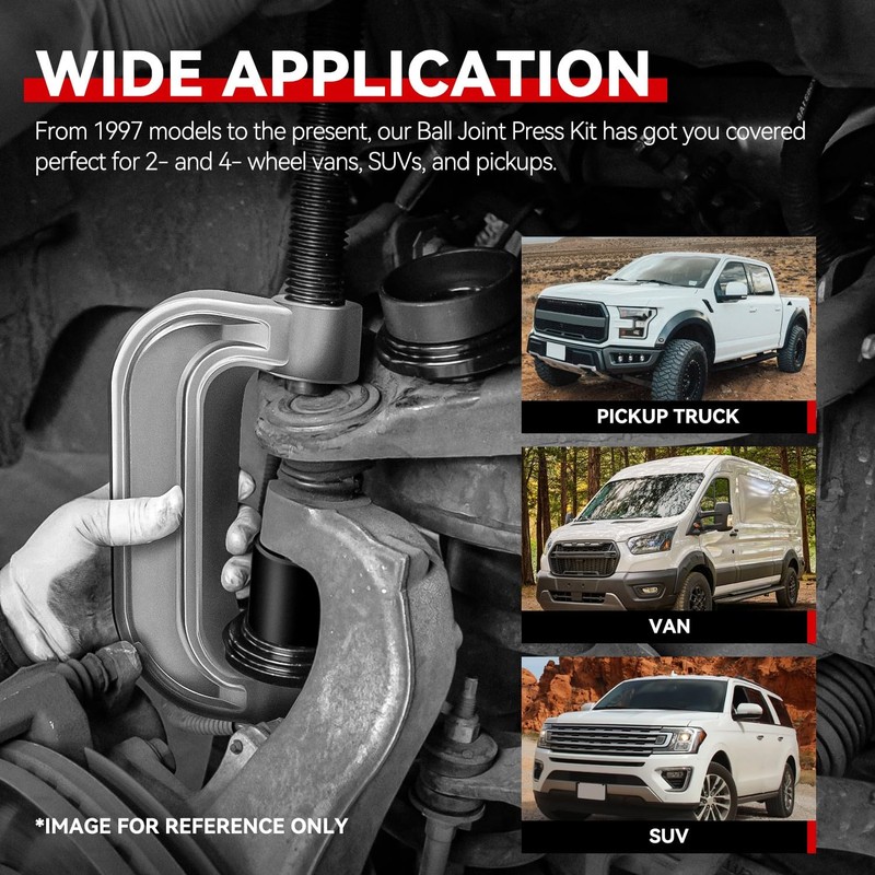 - Versatile Compatibility - This ball joint removal tool kit is designed to fit a wide range of vehicles, including most 2-wheel drive (2WD) and 4-wheel drive (4WD) cars and light trucks. It includes adapters in common sizes, ensuring compatibility various makes and models such as Pickup trucks, Vans, SUVs. Compatible with GM, Ford, Jeep, Dodge, and IHC vehicles.