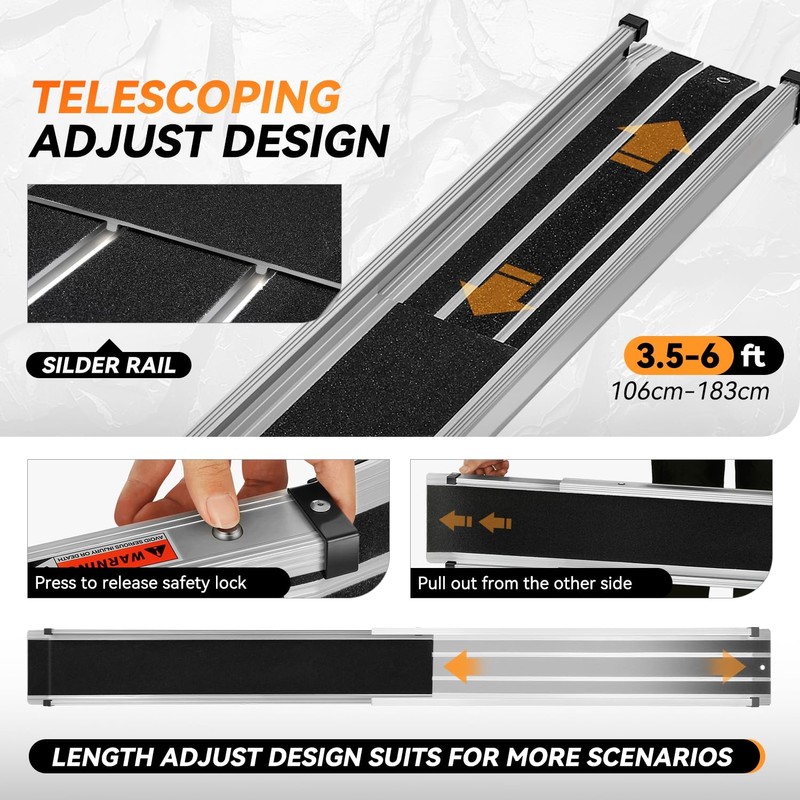 - Adjustable Wheelchair Ramp - The ramp length can be extended from 42’’ to 72’’ (3.5-6 ft) and comes with a 7.4'' W x 2'' H platform, offering spacious and safe access. NOTE: Please check the product size and weight before purchasing to ensure you buy the correct size.