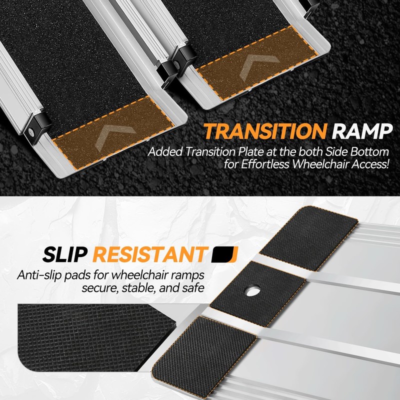 - Anti-Slip and Waterproof Design - The wheelchair ramp features an anti-slip pad design on the top ramp lip and a transition plate on the bottom lip, ensuring safe and stable transportation. Additionally, the black coating is rust-proof, waterproof, and slip-resistant, providing maximum traction even in adverse weather conditions.
