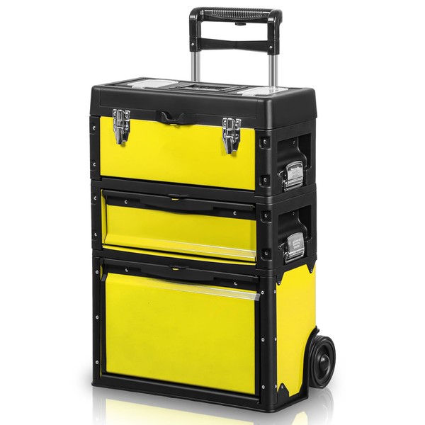 Auto Dynasty Stackable Tool Box 3-Tier Tool Separate Organizer Rolling Tool Chest with Wheels 3-in-1 Upright Trolley Tool Chest for Garage or Workshop, Yellow