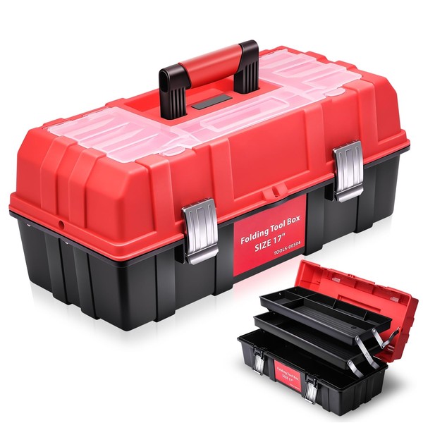 Auto Dynasty Tool Box Organizer Portable 3-layer Folding Toolbox with Non-slip Handle Tray for Garage, Workshop and On-the-Go Repairs, Red/Black