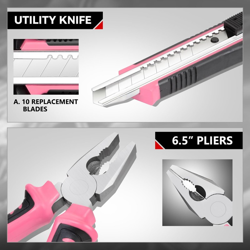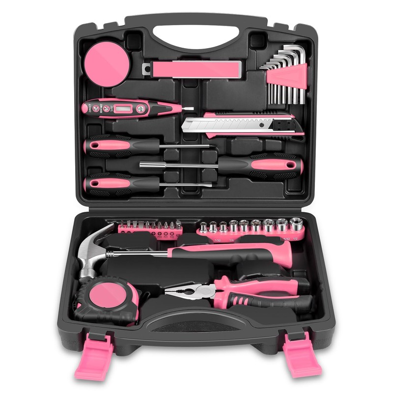 Auto Dynasty Tool Kit for Home 46-Pieces, Basic Household Hand Tool Sets with Screwdrivers Combination Tools, All in One Plastic Toolbox Storage Case for College Dorm, Office, Auto Repair (Pink)