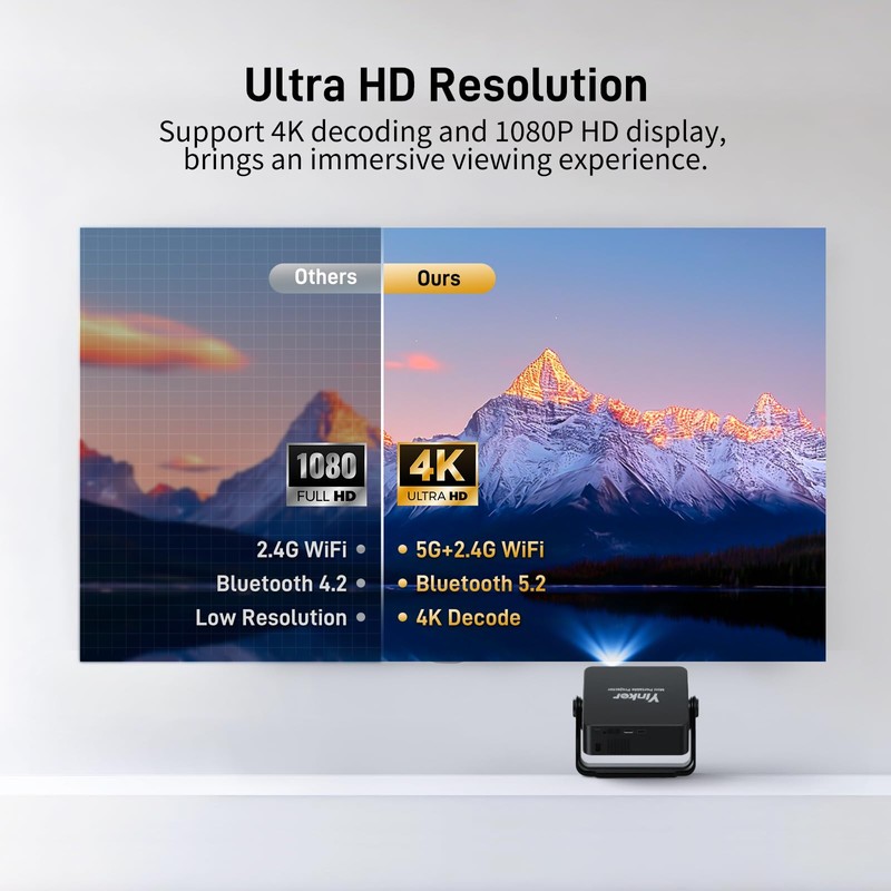 - [Dual Band WiFi and Bluetooth 5.2] Equipped with WiFi 6, supports both 2.4GHz and 5GHz, offering 3 times faster than traditional network. With the Bluetooth 5.2 can ensure stable connection and less latency between the projector and external devices(phone/speaker/headphone/...).