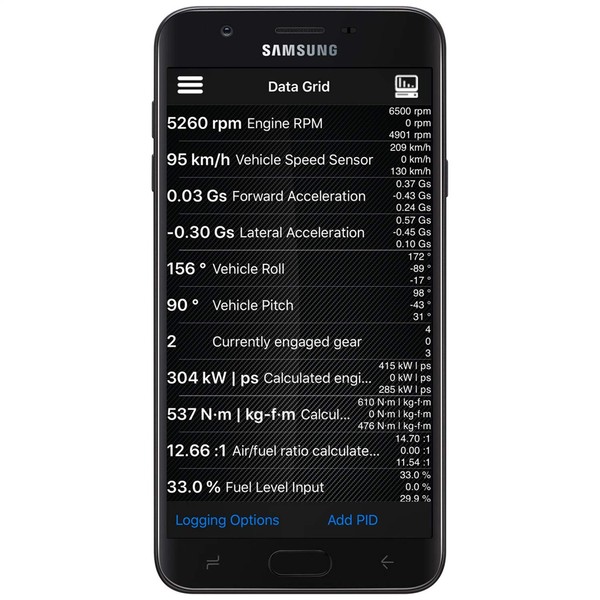 • Performance gauges: Engine speed, Corrected vehicle speed, Open/closed loop, Boost/vacuum combo gauge, Acceleration (and braking), Torque
