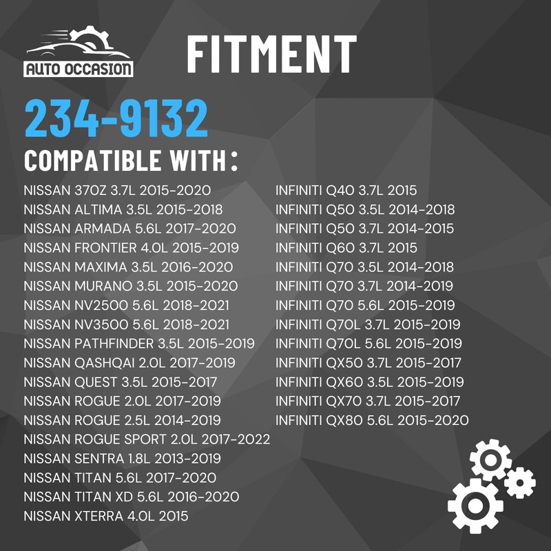 • FITMENT:Compatible with Nissan 370Z 3.7L 2015-2020,Nissan Altima 3.5L 2015-2018,Nissan Armada 5.6L 2017-2020,Nissan Frontier 4.0L 2015-2019,Nissan Maxima 3.5L 2016-2020,Nissan Murano 3.5L 2015-2020,Nissan NV2500 5.6L 2018-2021,Nissan NV3500 5.6L 2018-2021,Nissan Pathfinder 3.5L 2015-2019,Nissan Qashqai 2.0L 2017-2019,Nissan Quest 3.5L 2015-2017,Nissan Rogue 2.0L 2017-2019,Nissan Rogue 2.5L 2014-2019,Nissan Rogue Sport 2.0L 2017-2022,Nissan Sentra 1.8L 2013-2019,Nissan TITAN 5.6L 2017-2020,Nissan TITAN XD 5.6L 2016-2020,Nissan Xterra 4.0L 2015..Please refer to the detailed pictures.