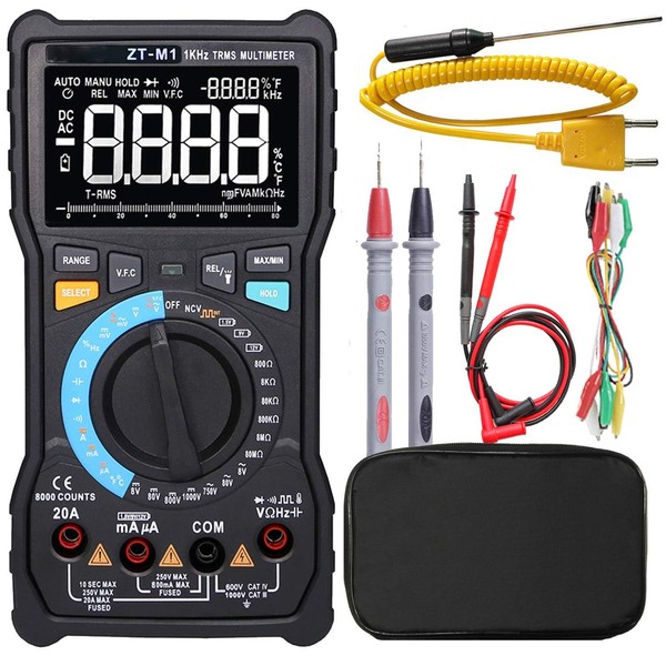 Auto Ranging Digital Multimeter TRMS 6000 with Battery Alligator Clips Test Leads AC/DC Voltage/Account,Voltage Alert, Amp/Ohm/Volt Multi Tester/Diode (ZT-M1)