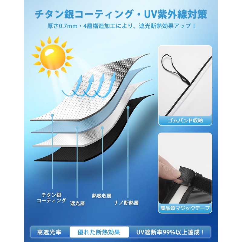 - 2. Improved version, 4 layers of high-density fabric: This product uses aluminum foil reflective layer and extra thick high-density non-woven fabric that effectively blocks 99.9% of UV rays. The 4-layer construction provides a high insulation effect that reflects strong sunlight in the summer to reduce the temperature of your car and protect your car from UV rays and create a comfortable interior space. This high density sunshade boasts an overwhelming quality that is great for both summer and winter seasons with special heat insulation and UV protection. Excellent thermal insulated blackout shade