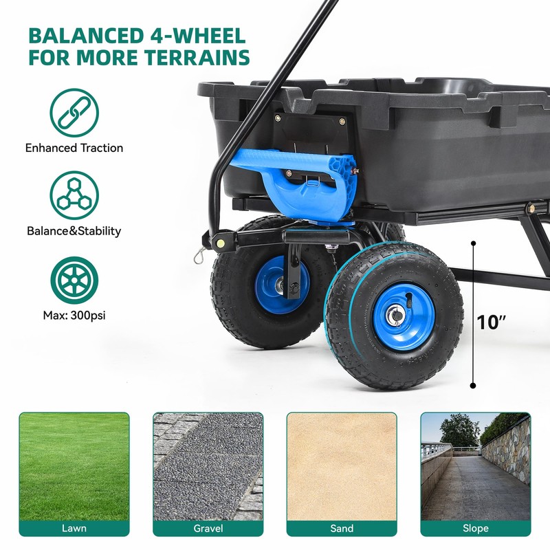 - 10" Pneumatic Tires for Various Terrains: The balanced 4 - wheel design with 10" pneumatic tires provides exceptional traction and stability on lawns, sand, snow, gravel and more. This utility cart can handle different terrains effortlessly.