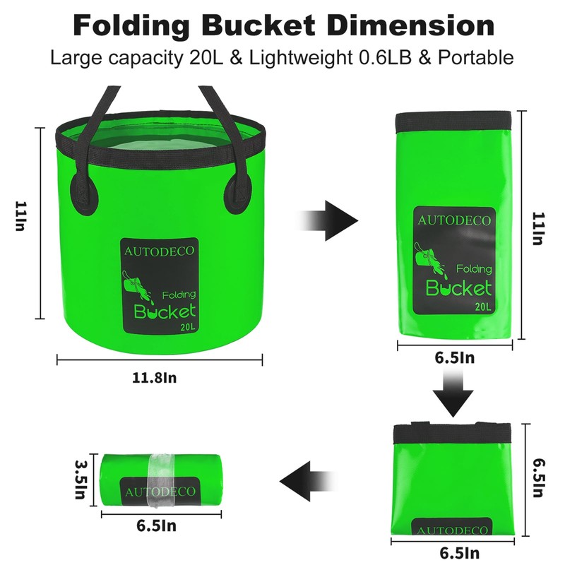 • Large Capacity & Portable: 20L (5 Gallon) capacity. Fully opened dimensions: Diameter 11" x height 11.8", Weight: 0.6LB. Folded size: 6.5" x 6.5". Rolled up size: 3.5" x 6.5". When folded or rolled up, it is space-saving, lightweight, and easy to carry