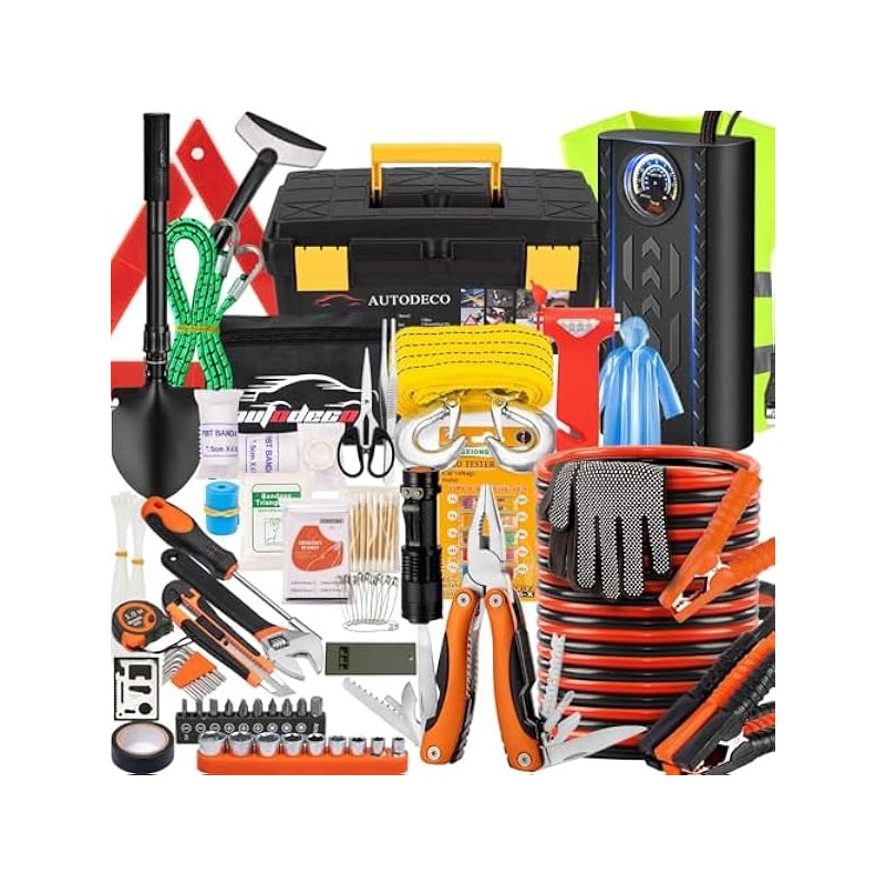 AUTODECO 98 PCS Roadside Car Emergency Assistance Kit with Portable Air Compr...