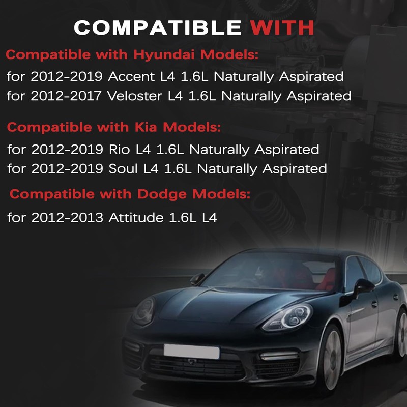 - Fitment: Compatible with Hyundai Accent 2012-2019 L4 1.6L Naturally Aspirated, Compatible with Veloster 2012-2017 L4 1.6L Naturally Aspirated; Compatible with Kia Rio/Soul 2012-2019 L4 1.6L Naturally Aspirated