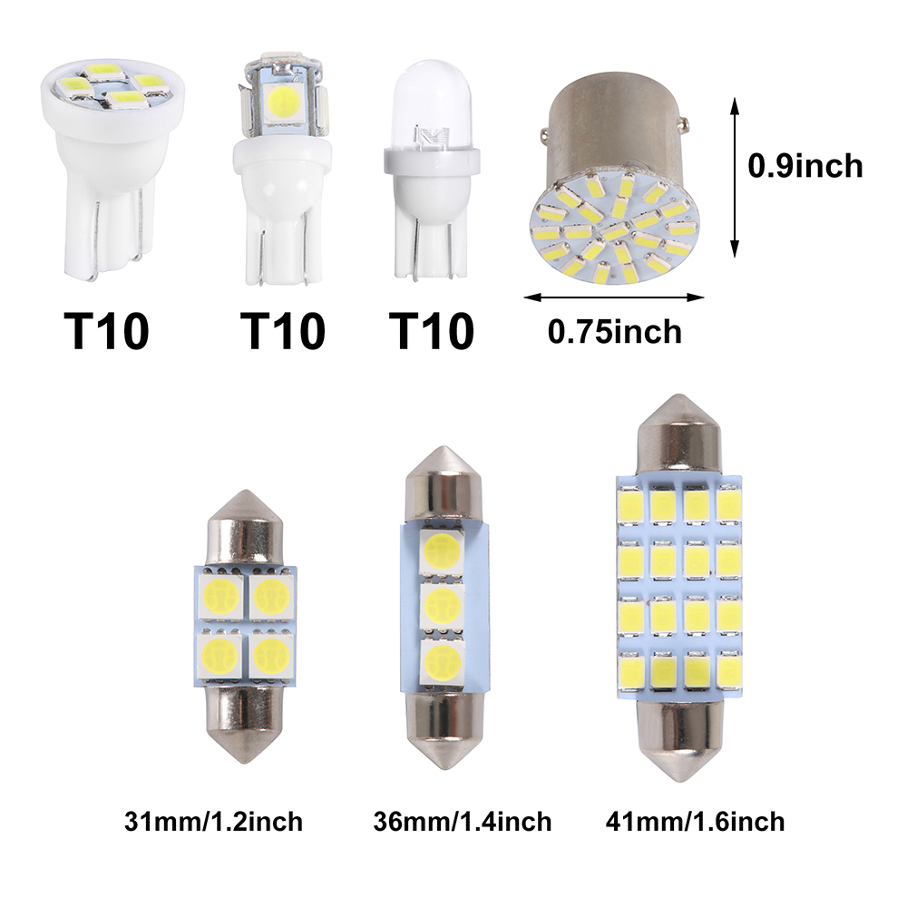 This Interior xenon white LED Kit Will Include the Following bulbs for applications around the interior of your vehicle, such as Dome, Map, Door, Glove Box, License Plates Etc.