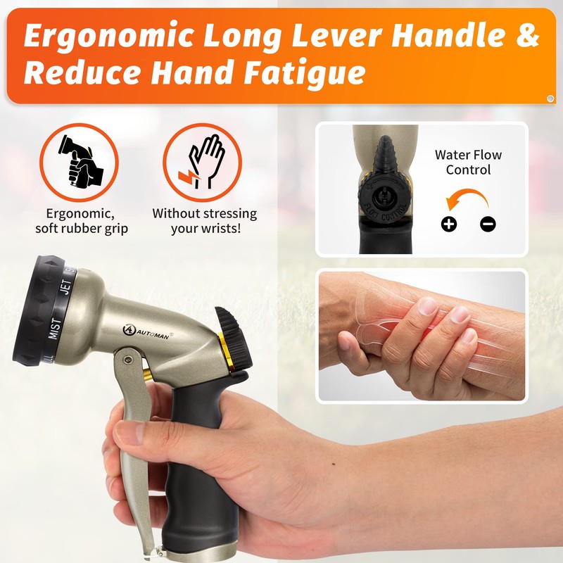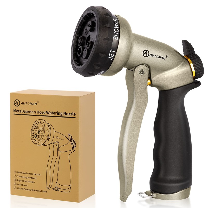 - ✅【DURABLE 100% METAL CONSTRUCTION】- The AUTOMAN garden hose nozzle is built using heavy duty metal. It better stands up to impacts and resists corrosion. The shock resistant rubberized bezel dial protects the nozzle from accidental drops. Our garden nozzle is 100% metal and high quality to prevent leaks, rusts and corrosions, much more durable than the plastic water nozzles.