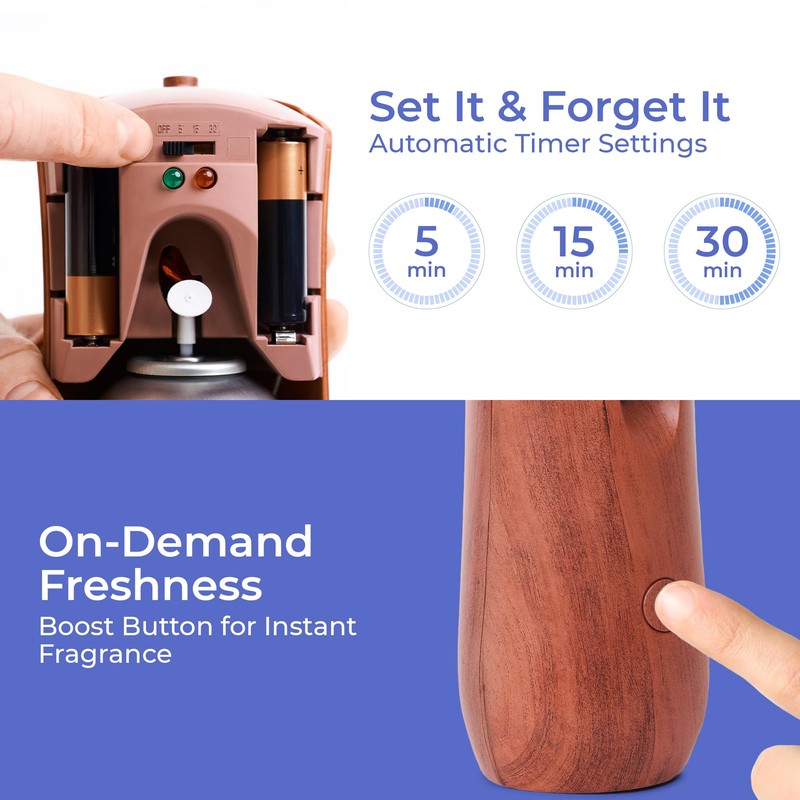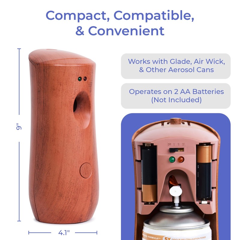 - Fresh and Clean - This automatic scent dispenser keeps rooms smelling great. It uses 2 AA batteries. Compatible with any standard automatic air freshener cans 5.51"x 2.56" (Aerosol Cans Not Included)