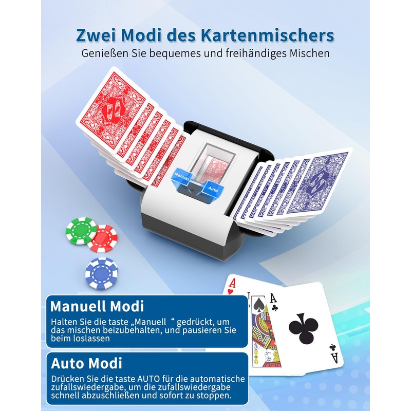- ONE BUTTON SHUFFLING: The automatic shuffler starts and shuffles the cards quickly with a single press of the automatic button. It automatically stops when mixing is complete, eliminating the need for a longer hold of the button as seen with other machines. Which is both convenient and efficient.