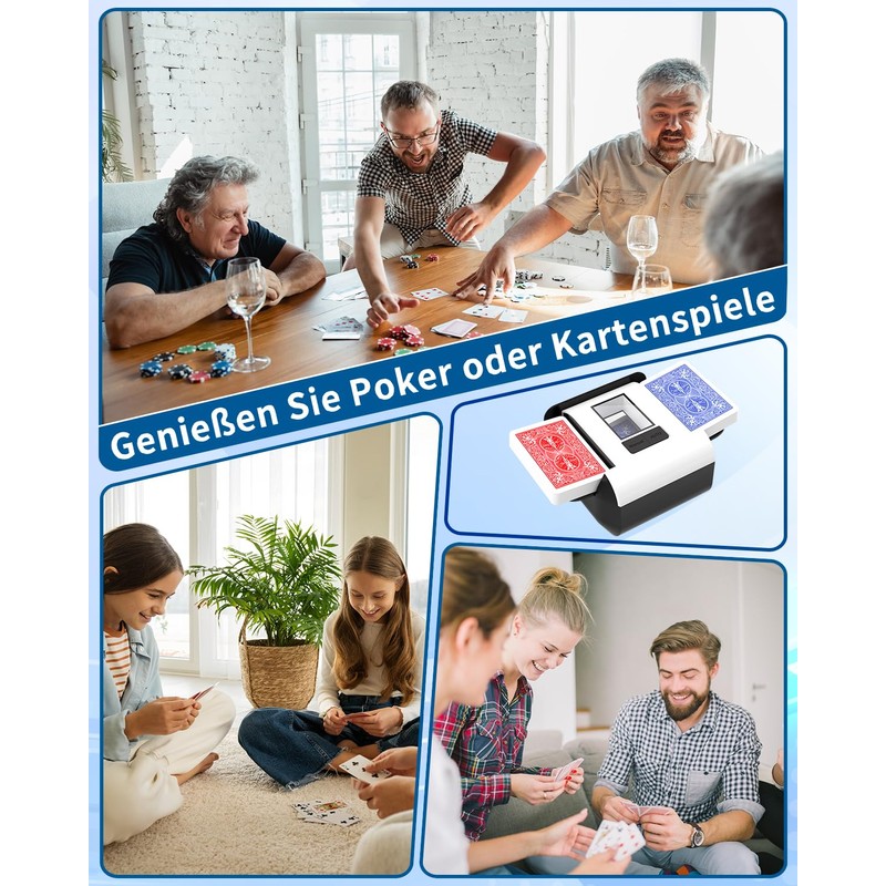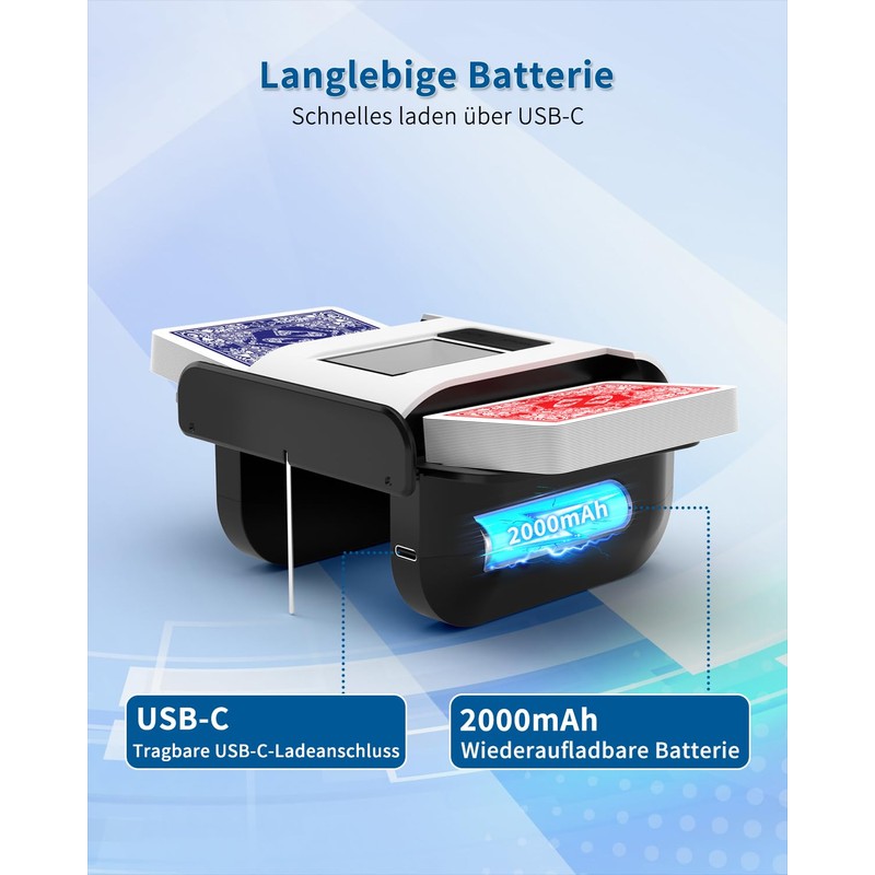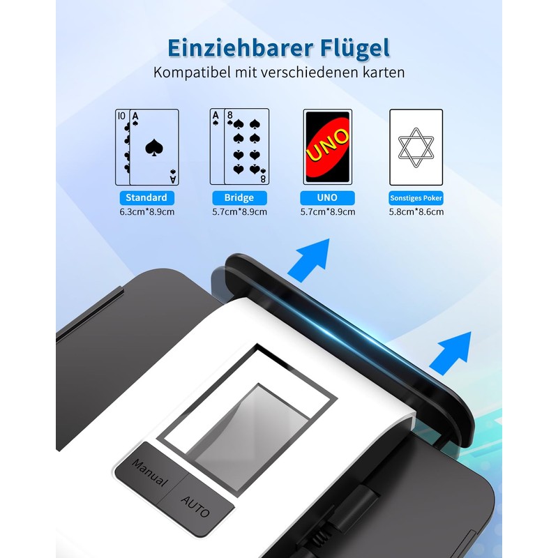 - Adaptable card sizes: the innovative retractable wing adjusts to different card sizes by simply pressing or pulling. The automatic mixing machine can handle 1-2 decks at once, perfect for standard cards, UNO, Texas Hold'em, Poker, Blackjack, Phase10, Skip-Bo and most standard size cards could fit.