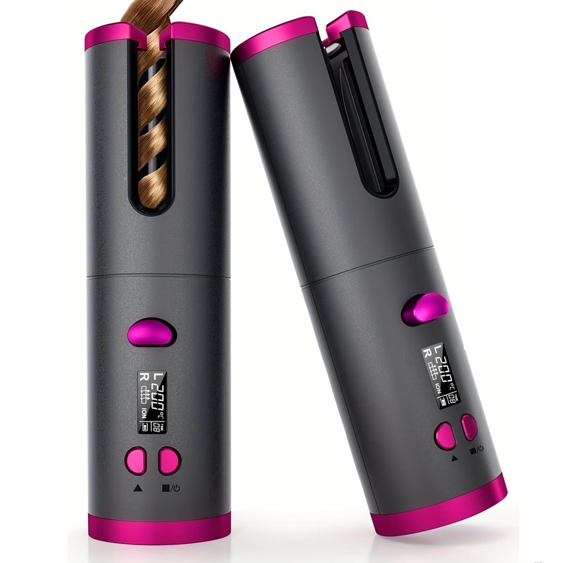 Automatic Hair Curler Wireless Automatic Hair Curler Ceramic Rotating Cordless USB Charging Timer LCD Digital Display(Pink)