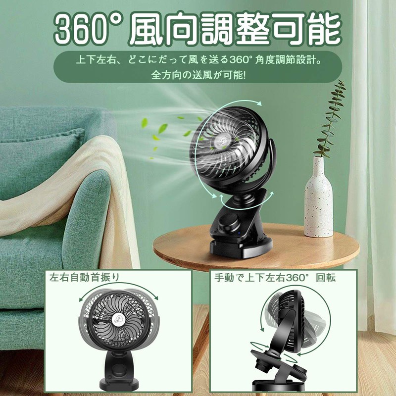 - Tabletop & Clip Fan & Automatic Oscillating Function: Can be placed on a tabletop as is. You can even clip it with a clip. Press the oscillating button to automatically turn the oscillating drive in the left and right direction, allowing wind to be delivered across a wide area. Manually adjust to 360 degrees up and down to the left and right, allowing for all directions
