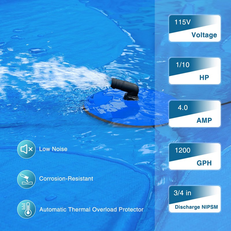Crestwave Automatic Pool Cover Pump, 115V Submersible Water Sump Pump for Pool Draining with 25ft Power Cord and 2 Adapters, Effortless Water Removal for Swimming Pool, Hot Tub, Pond