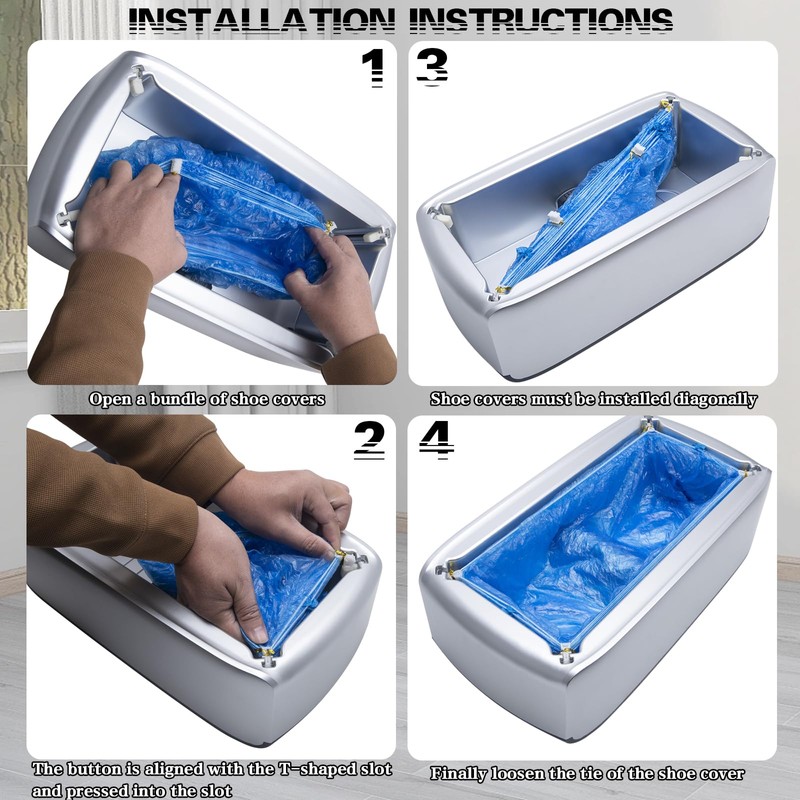 - 【Easy Installation】: When installing the shoe cover machine set, you only need to loosen the bundle of shoe covers, hold the T-shaped buckle, align it with the four corners of the shoe cover dispenser, and press it lightly to fix it in the slot. Ensure all fixtures pass this process. Pressing the pedal automatically releases the shoe cover, saving time and effort.