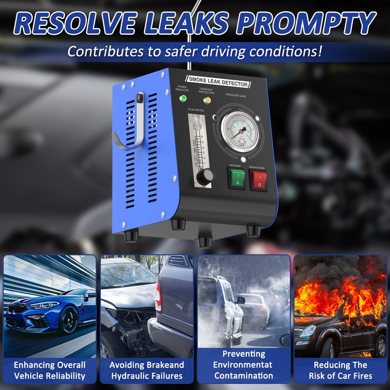 - Dual Modes: Built-in Air Pump for Fast, Accurate Results. Air Mode: Independent switch activates the built-in air pump (19 PSI pressure) to quickly identify if a leak exists via air flow sounds. Smoke Mode: Generates visible smoke (using baby oil/mineral oil) to pinpoint exact leak locations. No external equipment needed—works efficiently anywhere, saving time on diagnostics.
