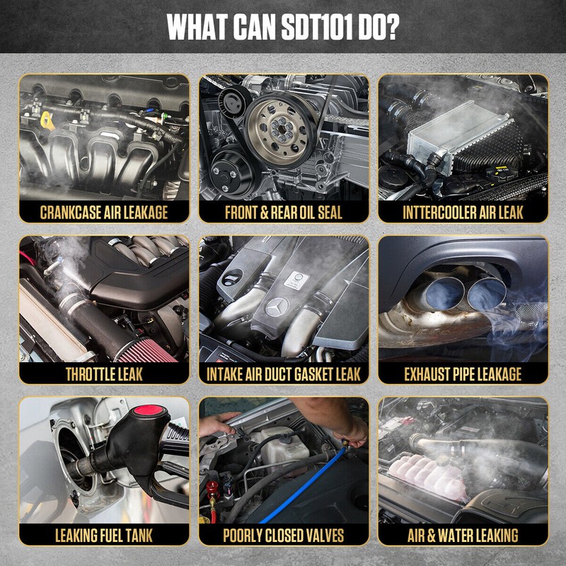 AUTOOL SDT101 Automotive Smoke Leak Detector, it can help you quickly diagnose pipeline leaks, through an external air source can output smoke in a few seconds, built-in regulator can output the standard EVAP system test pressure of 32mbar, even the smallest leak can be detected. Widely used in all automotive piping systems, crankcase systems, oil seal systems, air intake and exhaust systems, cooling systems tank systems, etc.