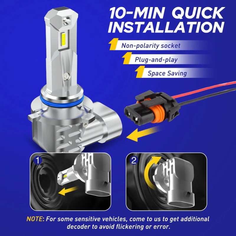 Hassle-free InstallationAUTOONE 9005/9006 led headlight bulbs feature a plug-and-play wireless and 1:1 size halogens’ design that allows people to get rid of bulky drivers and annoying wiring harnesses. No modifications on the enclosure or housing, 5 minutes easy installation