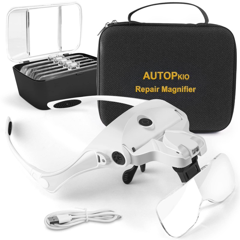 AUTOPkio Lupenbrille mit Licht Aufbewahrungstasche, USB Wiederaufladbar Kopflupe Stirnbandlupe Lupe Gläser für Brillenträger, 5 Linsen 1,0X 1,5X 2,0X 2,5X 3,5X