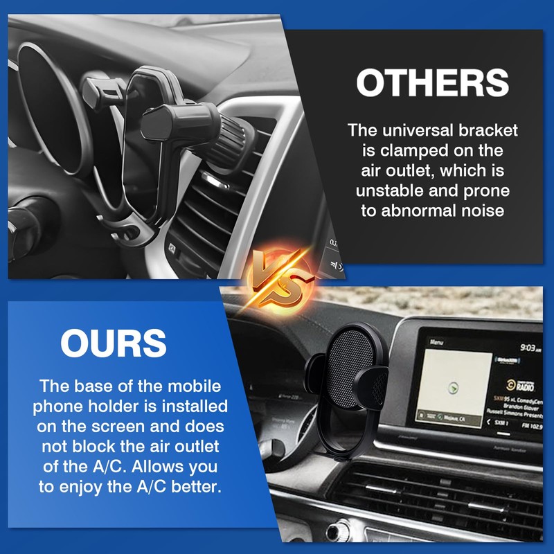 - Upgrade New Design---Different from ordinary cell phone holders, ours has an integrated design of touchscreen and phone stand, which does not block the air outlet. Real one-hand operation, you can use your phone just by one hand. The pivoting ball joint of the phone mount can rotate 360 degree, easily switch the phone to any angle.
