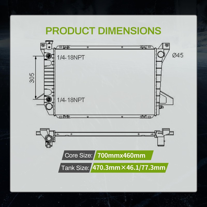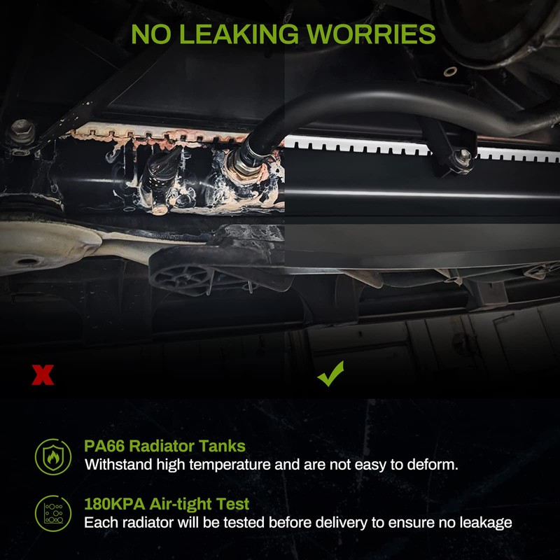 - LEAKPROOF MATERIAL: All products are subjected to leak tests, as the high-grade plastic tank & aluminum core are used in our radiators, which help ensure radiators' longevity
