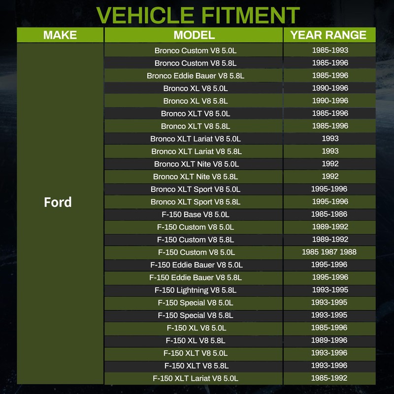 - Compatibility With-Radiator Compatible with 1985 1986 1987 1988 1989 1990 1991 1992 1993 1994 1995 1996 Ford F-150 1985-1997 F-250 1989-1998 F-350 1985-1996 Bronco 5.0L 5.8L V8. Please confirm the compatible vehicles before ordering, thank you