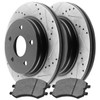 - Contains 2 front driver and passenger side disc brake rotors and 4 ceramic brake pads. Rotors are drilled to help keep the brakes cool, slotted to reduce dirt build-up, and black e-coated to prevent rust and corrosion. Ceramic brake pads produce less noise and dust than metallic pads
