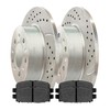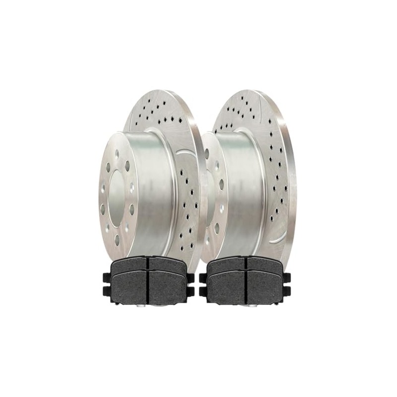 - This package contains 2 rear performance brake rotors and 4 performance ceramic pads. Rotors are drilled to help keep the brakes cool, slotted to reduce dirt build-up, and black e-coated to prevent corrosion. Performance ceramic pads produce less noise compared to traditional ceramic