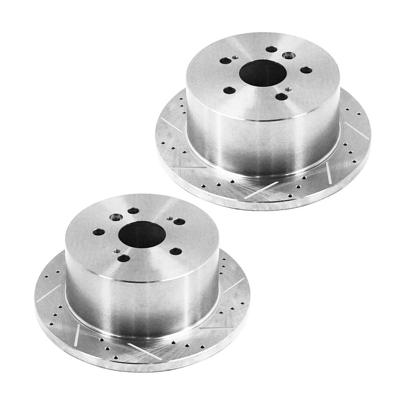 - This package contains 2 rear driver and passenger side drilled and slotted disc brake rotors. Cross drilled holes help keep the brakes cool during operation, while slots keep dirt and debris from building up between the pads and rotors. Silver zinc plated to help prevent rust and corrosion