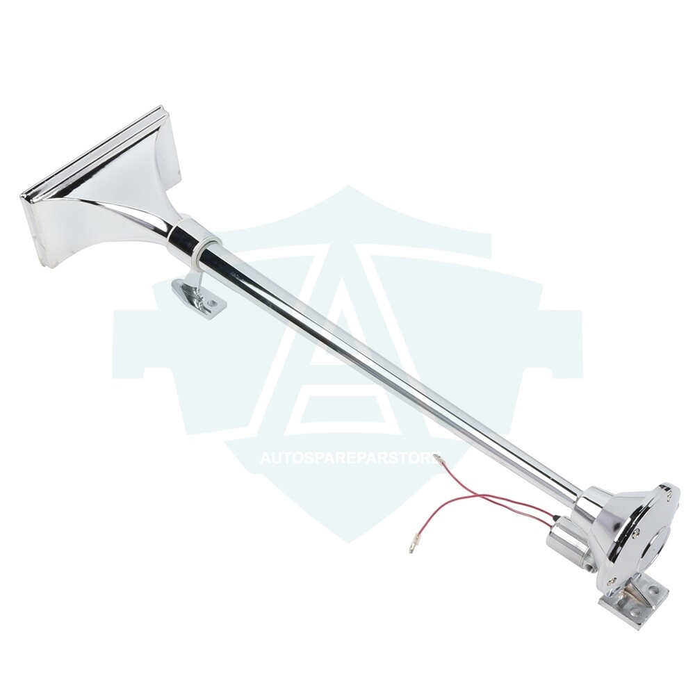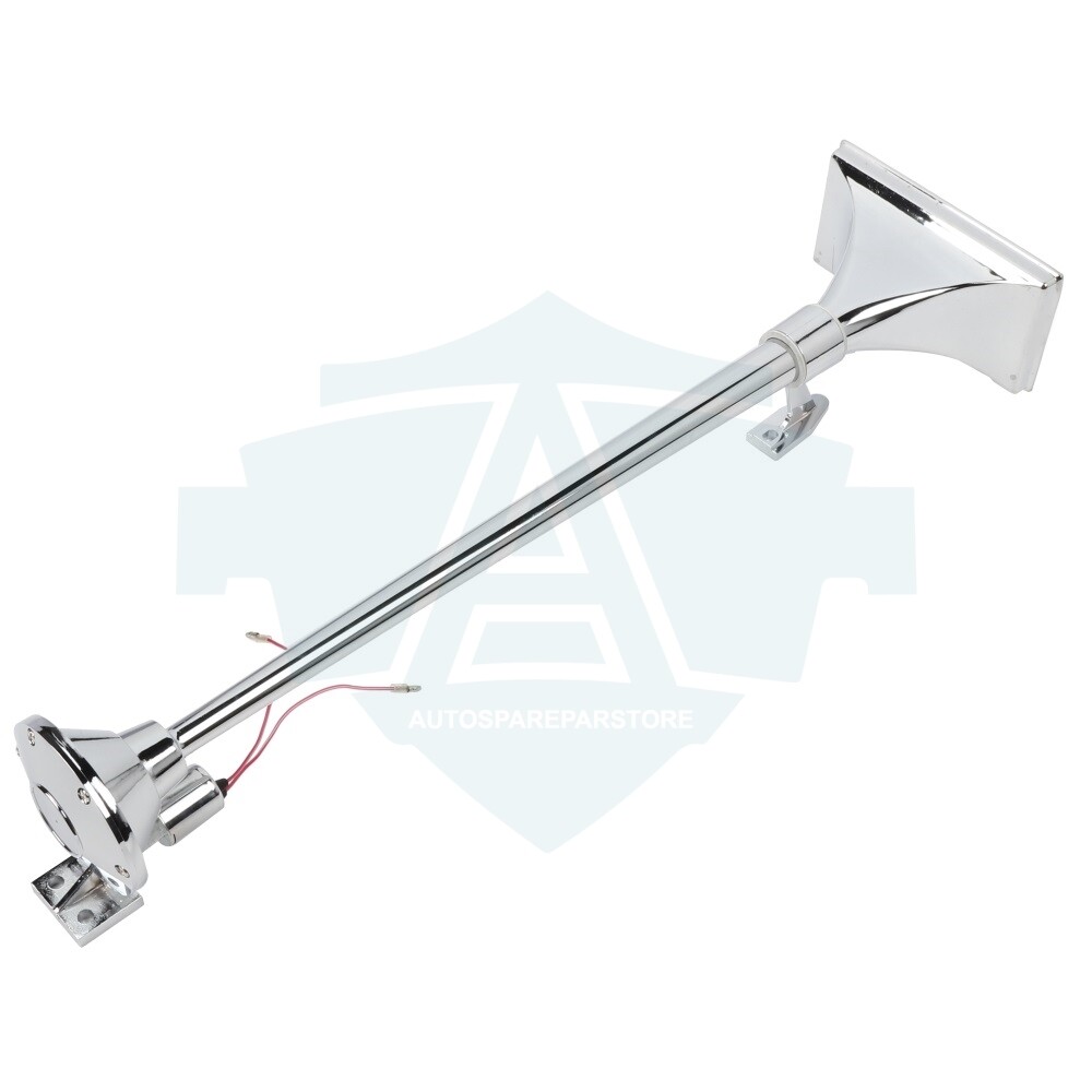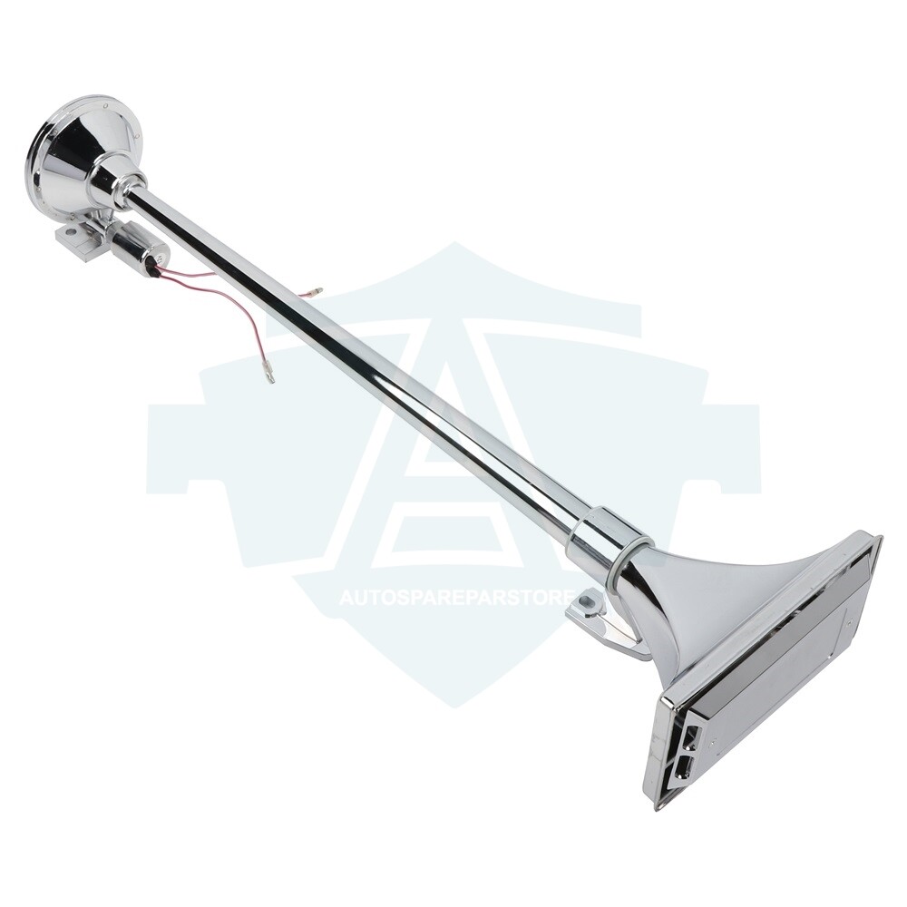 This chrome look trumpet produces a loud powerful sound. Constructed of metal to ensure maximum strength and durability with a front pedestal that eliminates vibration at high speeds or on rough roads. Horn comes with a 12V solenoid, rectangle weather protection cover and mounting hardware. An on-board air system is required for operation. Ideal for semi-trucks, and all vehicles with a 12V system.