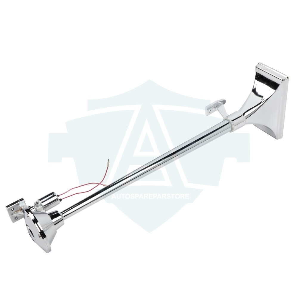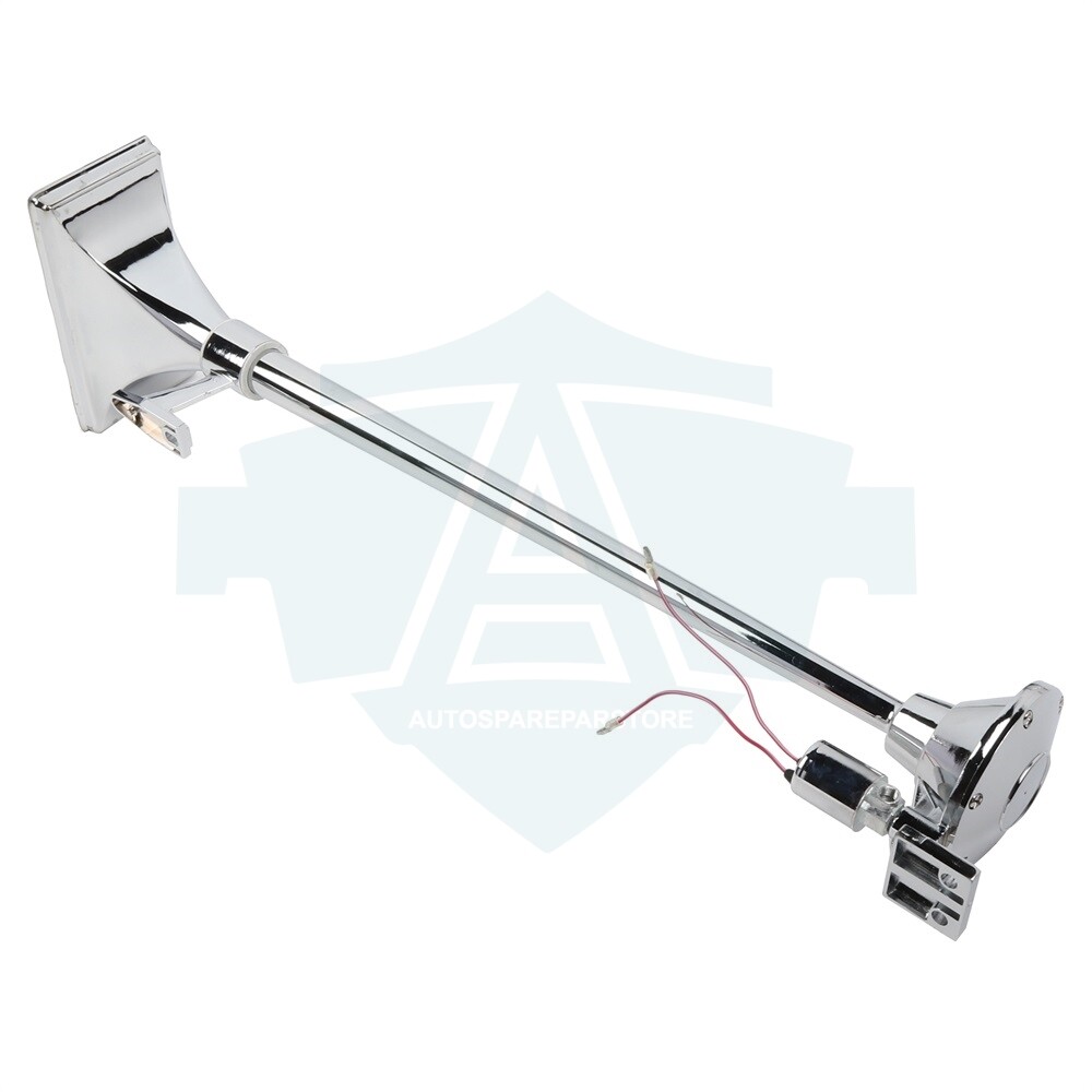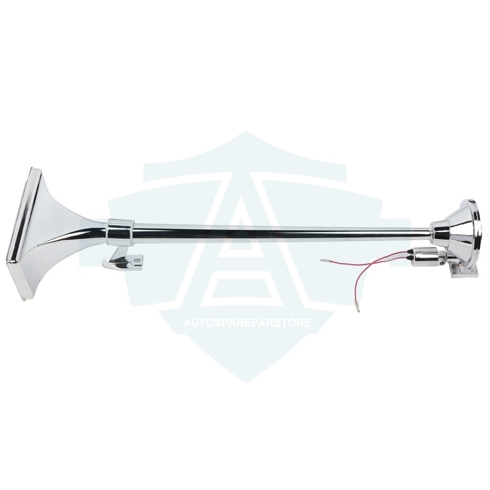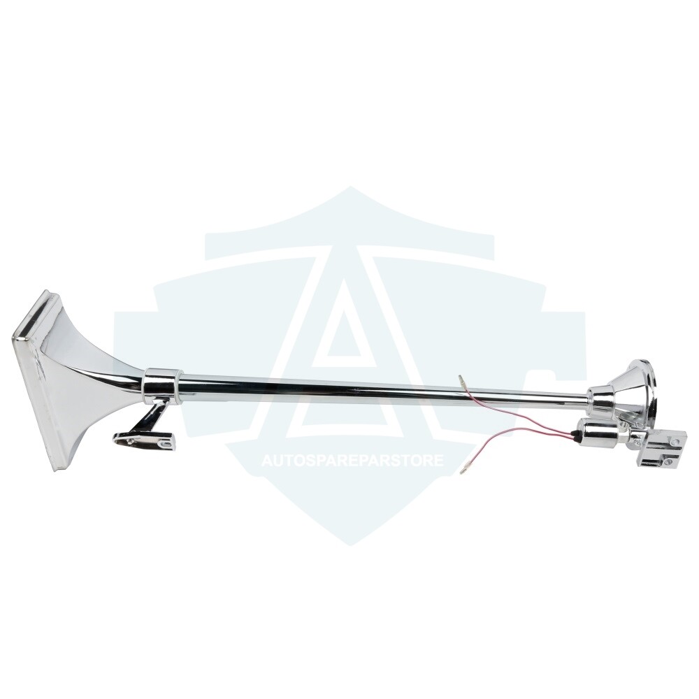 This chrome look trumpet produces a loud powerful sound. Constructed of metal to ensure maximum strength and durability with a front pedestal that eliminates vibration at high speeds or on rough roads. Horn comes with a 12V solenoid, rectangle weather protection cover and mounting hardware. An on-board air system is required for operation. Ideal for semi-trucks, and all vehicles with a 12V system.