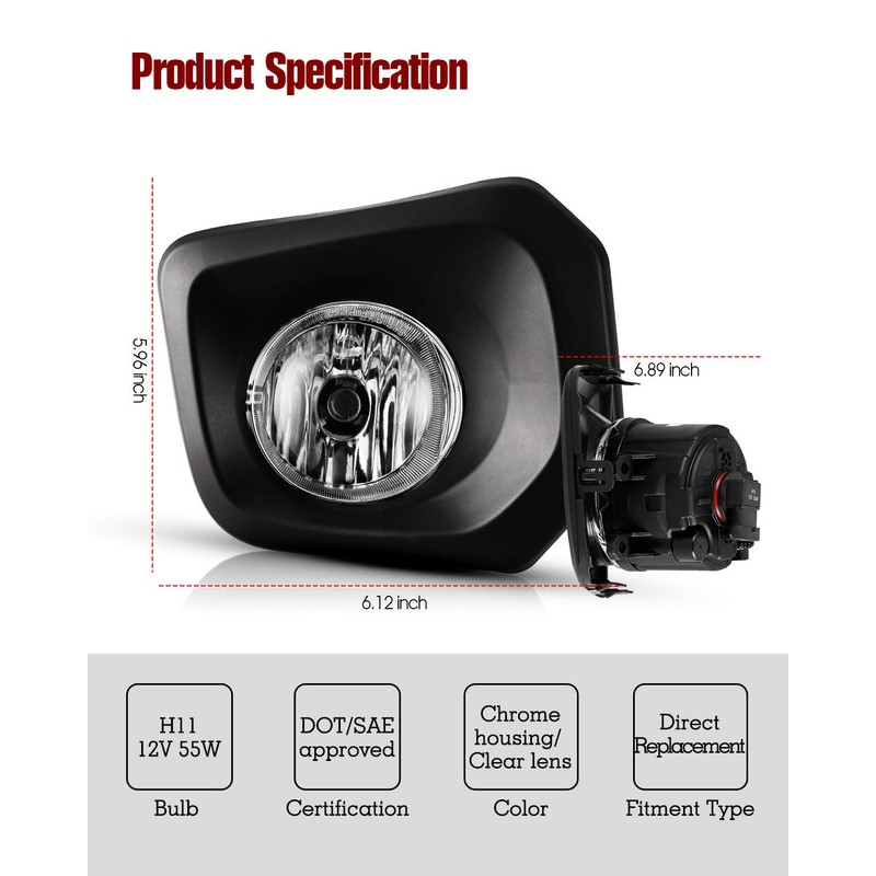 - Bright Illumination: The fog lights come with one pair of H11 12V 55W light bulbs, which allow you to see and be seen by oncoming drivers even through a thick fog. High intensity lamps provide exceptional illumination for increased driving safety.