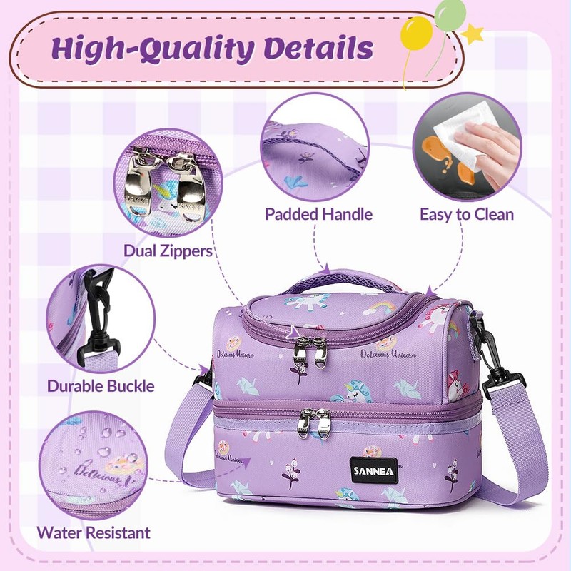AUTOWT Lunch Box Bag for Kids, Insulated Double Compartments Toddler Children Cooler Bag Note with Detachable Shoulders Strap for Boys & Girls School Picnic Daycare Kindergarten (Purple Unicorn)