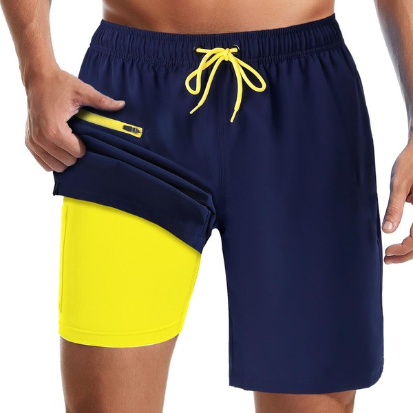 AutoWT Mens Swim Trunks with Compression Liner, 2 in 1 Swim Shorts for Men Swimming, Quick Dry Swimwear Beach Shorts Bathing Suits with Pockets, Dark Blue, M