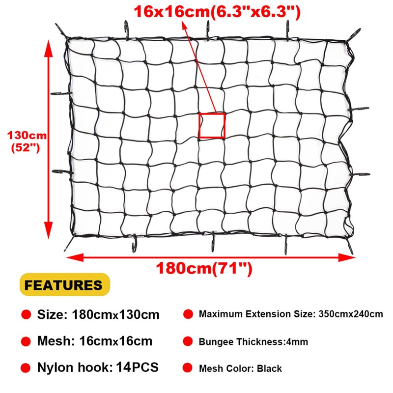 - Large Roof Cargo Net: This 130x180cm cargo net is made of high-quality latex, which can achieve super stretch function and can be stretched to 350x240cm. easy to cover larger cargo such as luggage, tarps, etc. Comes with a tight mesh to prevent small items from falling out during travel.