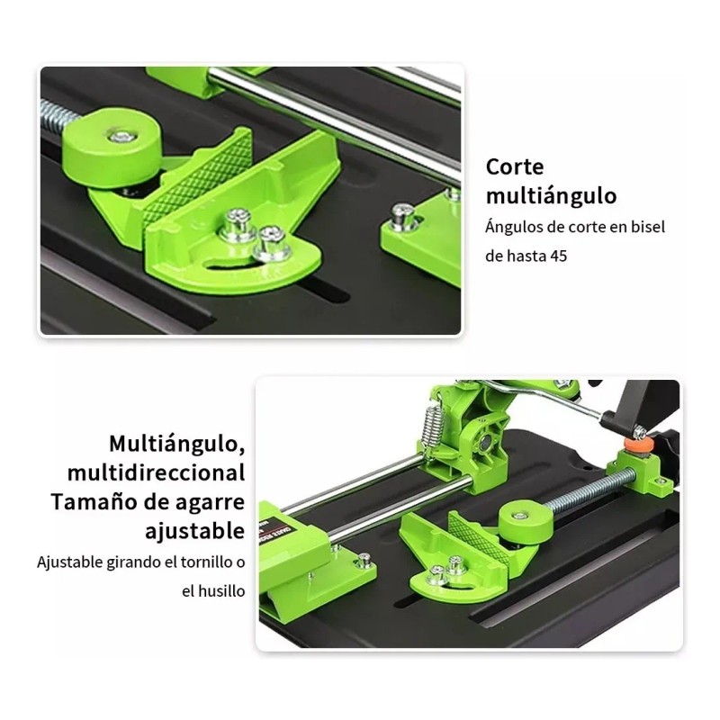 1. Soporte de molinillo con rieles deslizantes compatible con discos de 100 mm, 115 mm y 125 mm. Cuenta con ajustes de grado, apertura del tornillo de banco, tamaño de esmeril, ancho de esmeril, compensación de corte y configuración de compensación de corte.