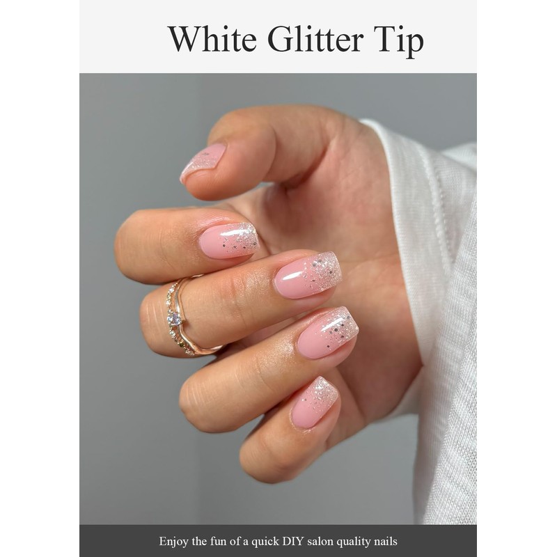 AutyaMee Semi Cured Gel Nail Strips (White Glitter Tip), 20 Pcs Pink Gel Nail Wraps, Stickers, UV Light Required, Salon Quality, Long Lasting