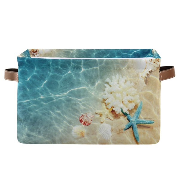 AUUXVA Storage Basket Tropical Sea Beach Starfish Seashell Storage Cube Box Durable Canvas Collapsible Toy Basket Organizer Bin with Handles for Shelf Closet Bedroom Home Office