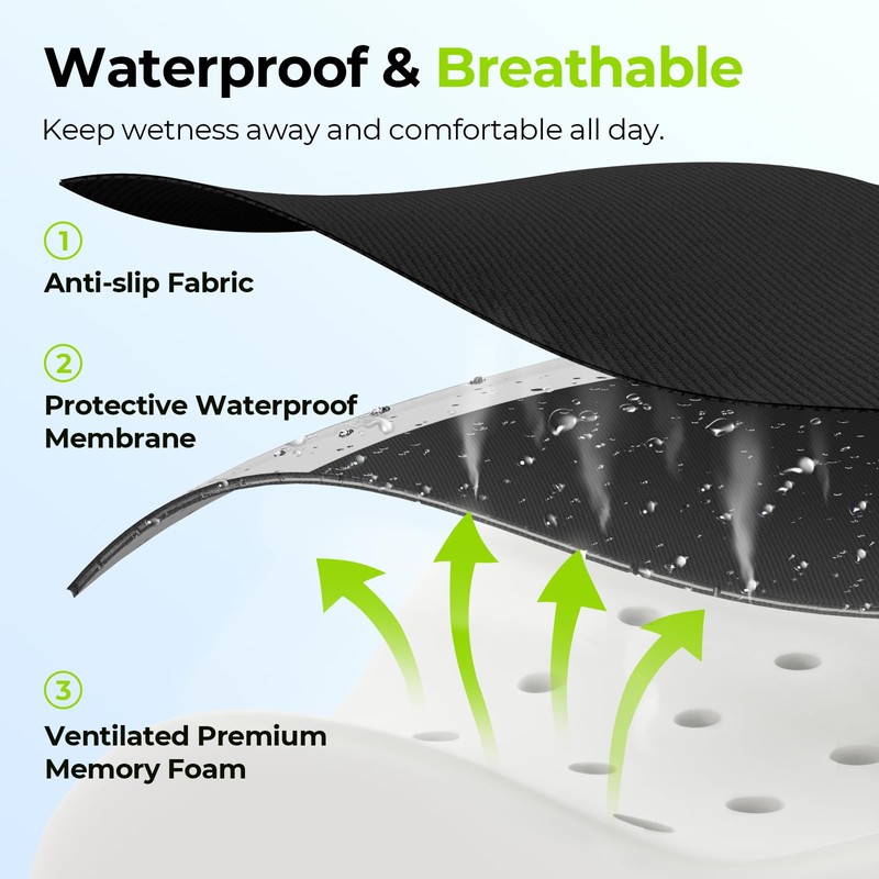 - Breathable & Waterproof Performance. The orthopedic seat cushion features ventilated memory foam with air holes to reduce stuffy feelings and risks of pressure sore and ulcers from long sitting. The inner waterproof membrane prevents sweat or urine from eroding the memory foam. *To preserve the quality of the cover, please wash it separately on a gentle cycle with cold water (ideally between 65°F and 85°F) to prevent damage. After washing, please air dry to maintain its fibers. High temperatures should be avoided to ensure the cover's longevity and appearance, and do not wash memory foam.
