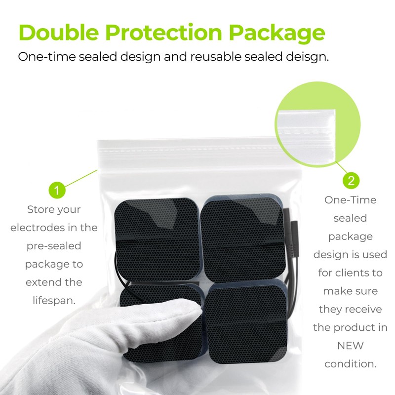 - Trusted Quality. Low impedance solid electrode gel is made by upgraded industry leading American adhesive, which can provide excellent self-adhesive performance and easy clean up for maximum 45 uses. Our medical grade reusable electrodes for electrical stimulation are pure and non-irritating to ensure users of all skin types have a safe, comfortable experience.