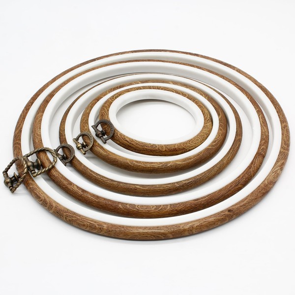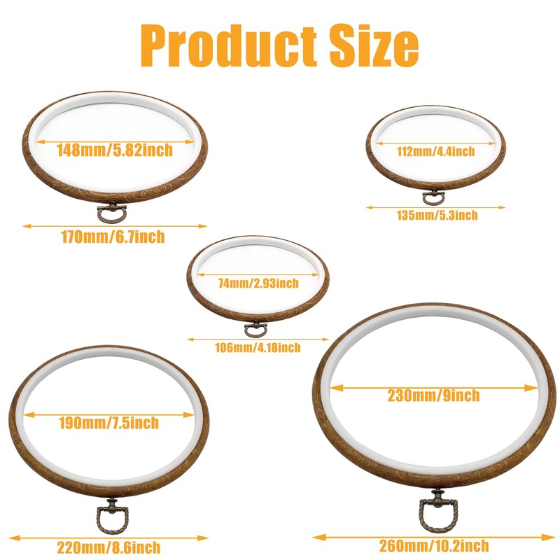 - 【Package & Size】- 5Pcs round imitated wood embroidery hoops with hanging ring. Outer ring diameter: 4.18"+5.3"+6.7"+8.6"+10.2". Five sizes of embroidered frames are suitable for different sizes of fabric, and the combination set meets your various needs.