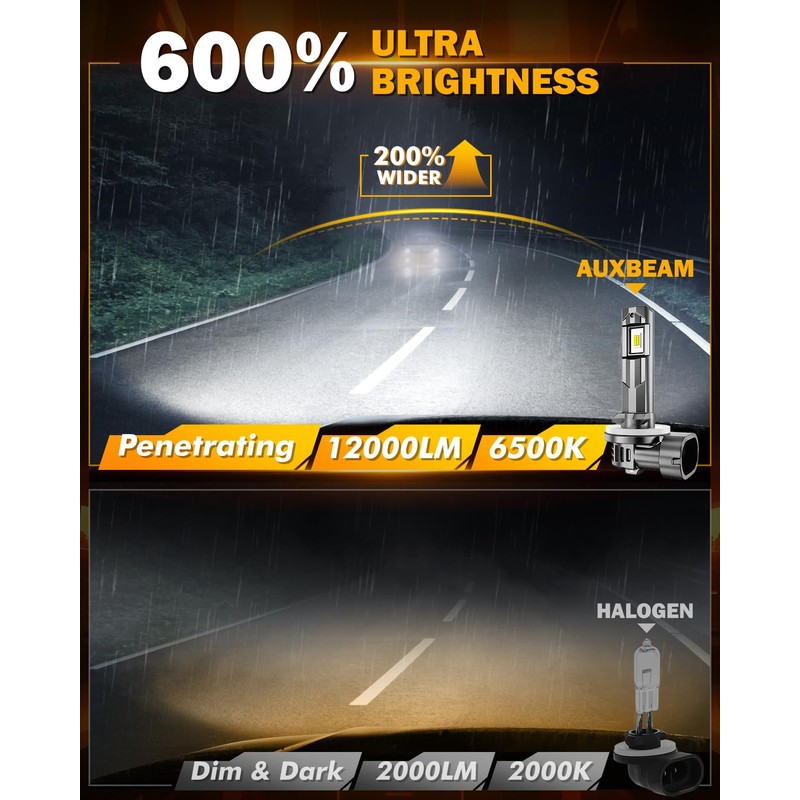 - 600% ULTRA BRIGHTNESS: Upgraded double-sided 16 PCs 5530 CSP chips, Voltage: 9V-12V(DC), 12000 lumen per set, 600% penetrating brightness, 200% wider vision, 6500K White focused beam, cutting through dense fog and heavy rain with ease