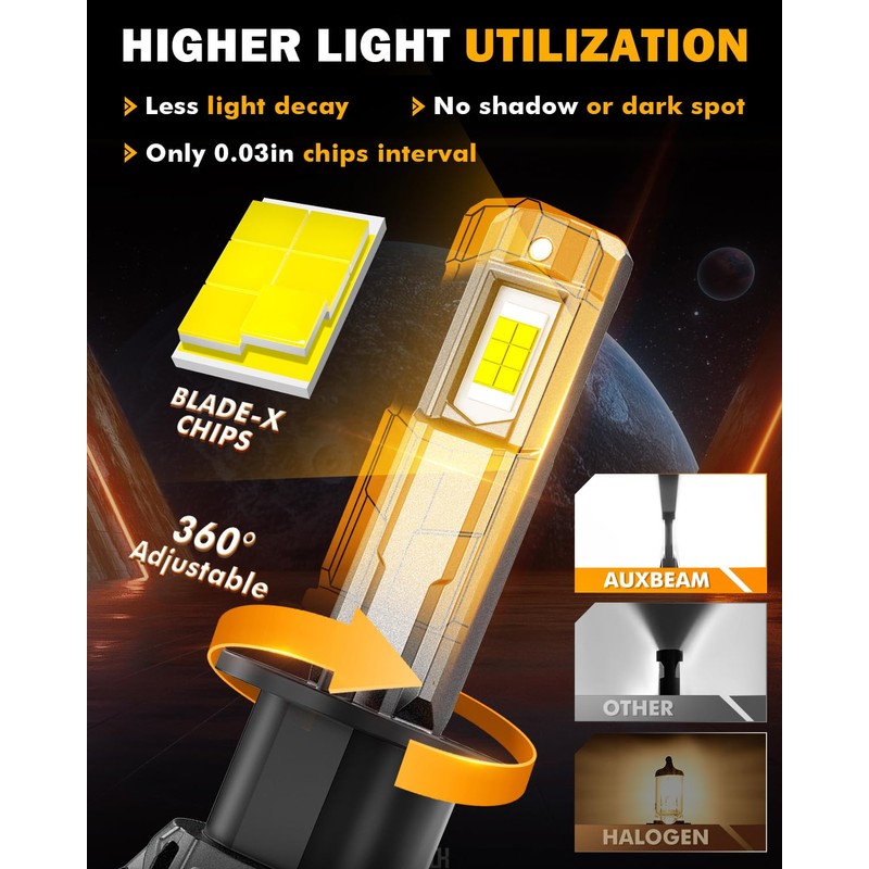 • Penetrating Brightness: 24 PCs Blade-X chips, Voltage: 9V-12V(DC), high output 22,000 lumens per set, 600% penetrating brightness, 300% more night vision, 6500K white focused beam. No dark spots, no shadows, no blinding traffics. Higher light utilization than others due to the latest light-diffusing tech