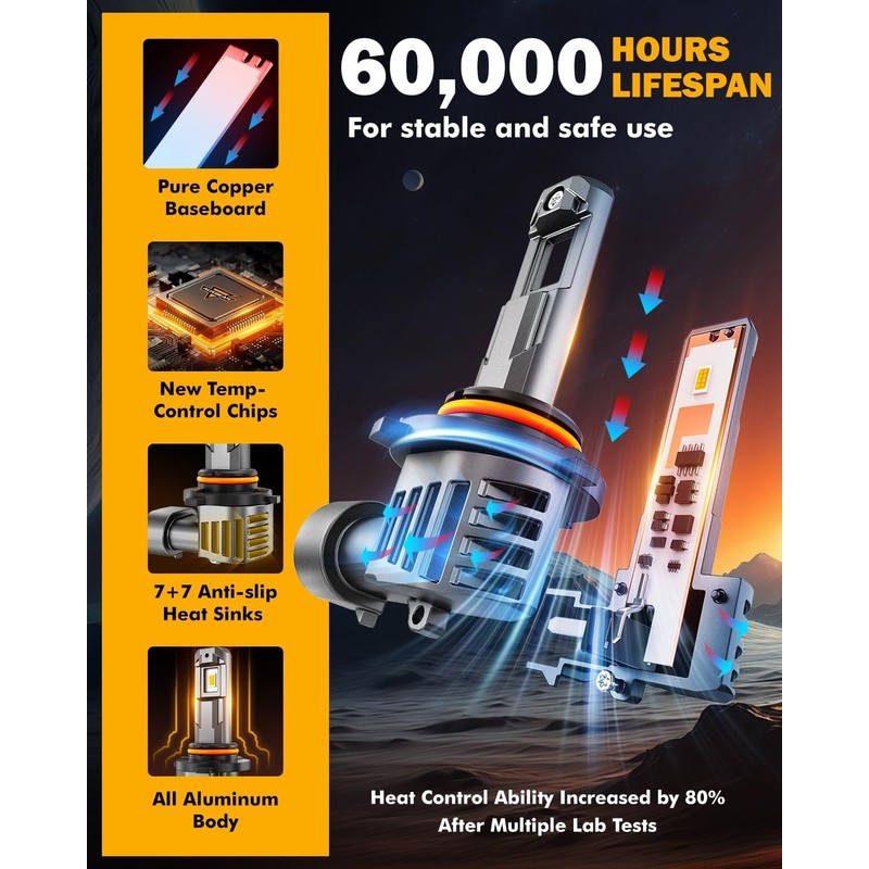 - 60,000HRS LONG LIFESPAN: Joint heat control design - The built-in latest temp control chips, 7+7 Anti-slip heat sinks, pure copper baseboard, all aviation aluminum shell directly improves 80% heat dissipation. The fanless and sealing design effectively isolates dust and water mist, preventing it failure and greatly reducing wear